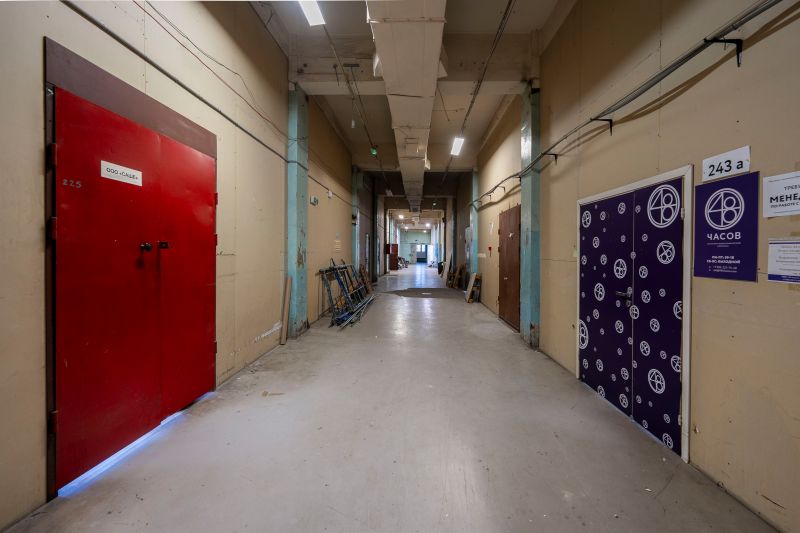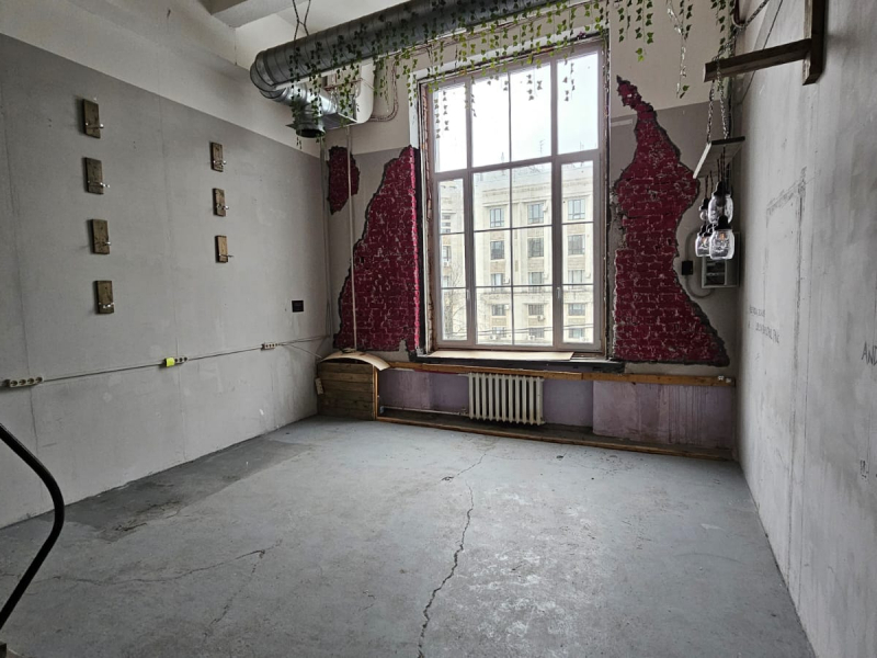 Высота потолка 4,8 м, окрашенные стены, бетонный пол.