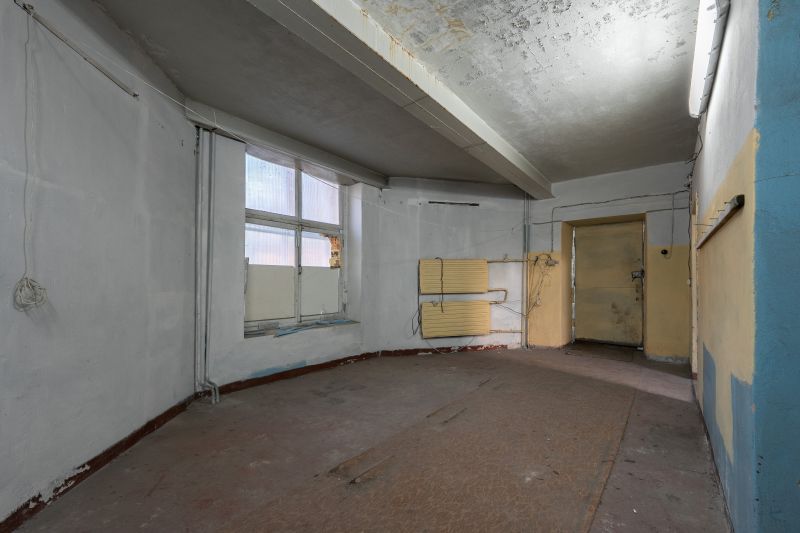 Внутри ровный бетонный пол и стены, потолки высотой 2,96-5,1 м, отдельный вход.
